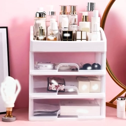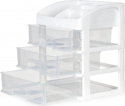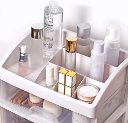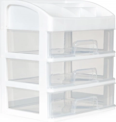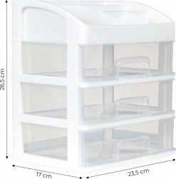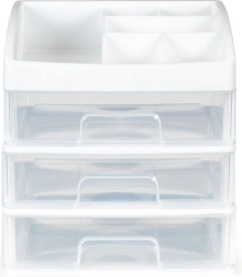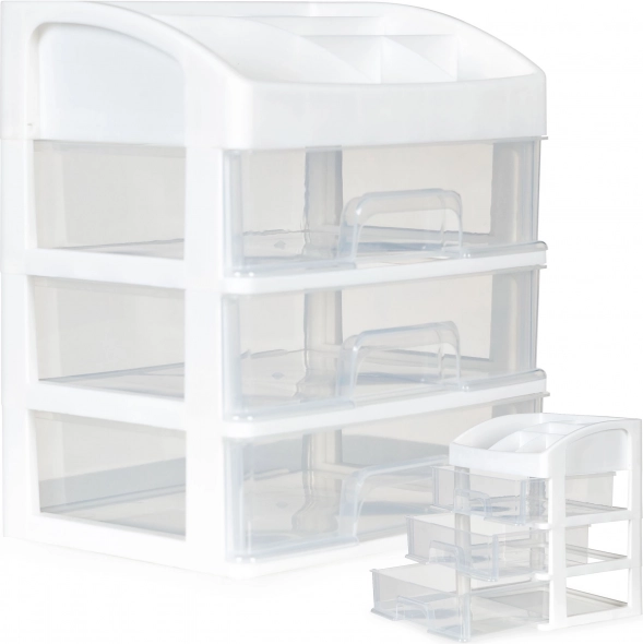 Udržujte svou kosmetiku organizovanou a přehlednou s naším elegantním bílým plastovým organizérem. Jeho praktická konstrukce nabízí několik přihrádek a tři průhledné šuplíky, ve kterých lze snadno uskladnit jakékoli drobnosti.