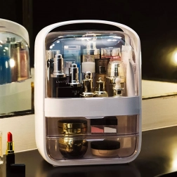 Tento kosmetický box v elegantní bílé barvě vám pomůže mít každodenní péči vždy po ruce. Horní přihrádka s průhledným výklopným víkem pohodlně pojme lahvičky krémů, séra, parfémy i vyšší balení, zatímco dvě prostorné zásuvky udrží drobnosti jako paletky, rtěnky nebo štětce přehledně a chráněné před prachem.