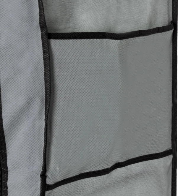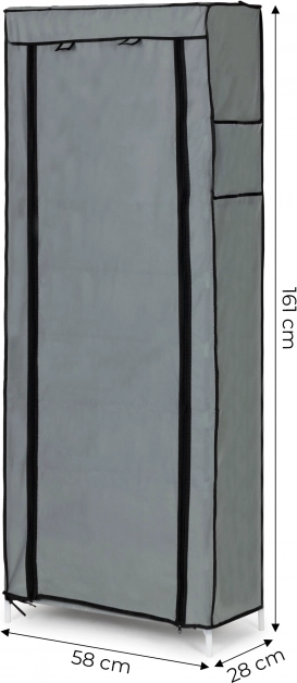 Rolovací clona se dvěma zipy chrání uložené věci před prachem a umožňuje rychlý přístup. Kompaktní rozměry 58 × 28 × 161 cm se hodí i do menších místností.