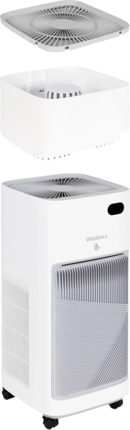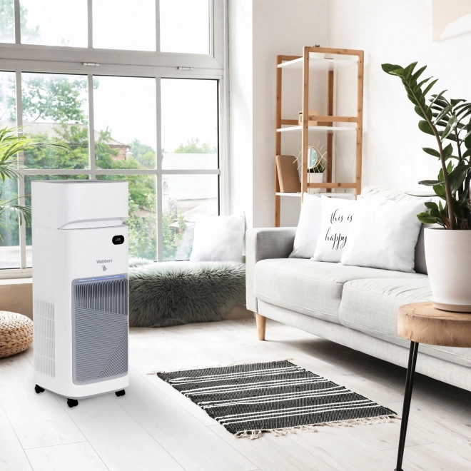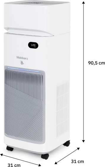WEBBER AP9650 je chytrá čistička vzduchu s integrovaným zvlhčovačem, která se postará o zdravé klima doma i v kanceláři. Kombinuje předfiltr, HEPA 13, uhlíkový filtr, UV‑C a vodní filtr se zvlhčovací výparnou, aby vzduch byl nejen čistý, ale i příjemně hydratovaný. Díky True Lumos Smart Scan průběžně monitoruje kvalitu vzduchu a automaticky volí optimální nastavení.