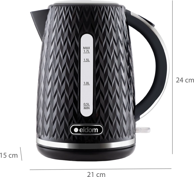 Stylová rychlovarná konvice ELDOM C260 Nelo s objemem 1,7 l a výkonem 2000 W spolehlivě uvaří vodu pro celou rodinu. Nabízí bezdrátové provedení se 360° otočnou základnou, přehledný ukazatel hladiny vody, automatické vypnutí a trojitý bezpečnostní systém. Kvalitní OTTER komponenty, pohodlné tlačítko pro otevření víka a moderní texturovaný design se skvěle hodí do každé kuchyně.