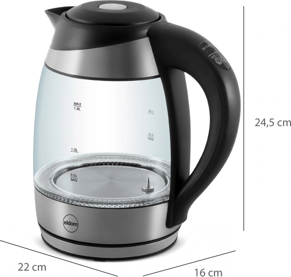 Konvice má objem 1,8 l, minimální var od 0,5 l a zakryté topné dno pro snadné čištění. Skleněná nádoba s LED osvětlením, otočná 360° základna, vyjímatelný filtr a ukazatel hladiny vody zvyšují pohodlí každý den. Trojitá ochrana proti přehřátí, přepětí a spuštění bez vody zajišťuje bezpečný provoz.