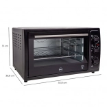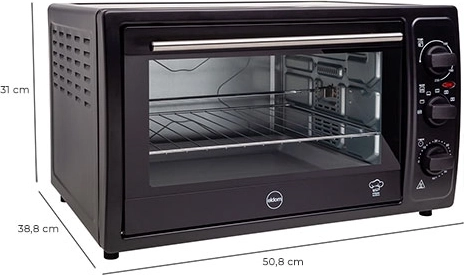 Uvnitř najdete osvětlenou pečicí komoru s odolným dvojitým sklem z tvrzeného skla pro lepší izolaci. Ovládání je jednoduché pomocí otočných knoflíků: nastavíte funkci, teplotu i čas. Po uplynutí času vás upozorní zvuková signalizace a trouba se automaticky vypne.