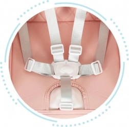 Pětibodový bezpečnostní pás s pevným středovým přezkovým zámkem drží dítě ve správné poloze a brání sklouznutí během jídla i hraní.