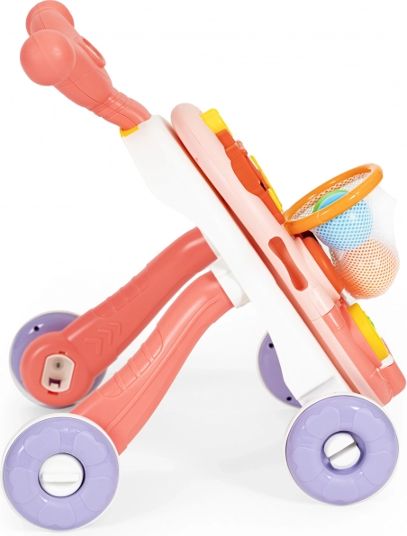 Rukojeť má dvojstupňové nastavení výšky pro přizpůsobení postavě dítěte. Chodítko podporuje učení chůze, posiluje rovnováhu, koordinaci oko–ruka i jemnou motoriku a zároveň poskytuje pestrou, smyslově podnětnou zábavu.