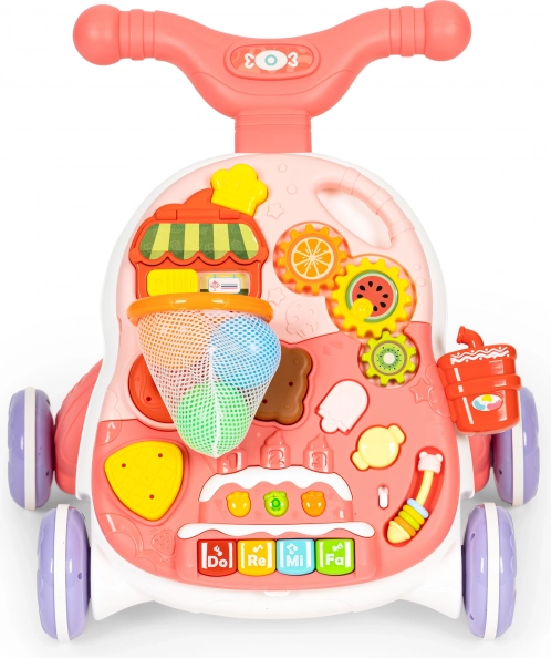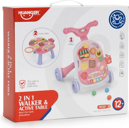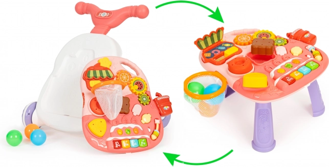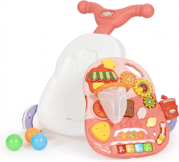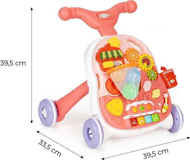 Přední interaktivní panel je vybaven barevným pianem se zvuky a melodiemi, ozubenými kolečky, vkládačkou tvarů se 3 kostkami, košem pro házení 3 plastových míčků a odnímatelnou chrastítkovou hrnečkovou hračkou. Odnímatelný panel snadno nasadíte na tři nožky a vytvoříte samostatný stolek pro hru vsedě.