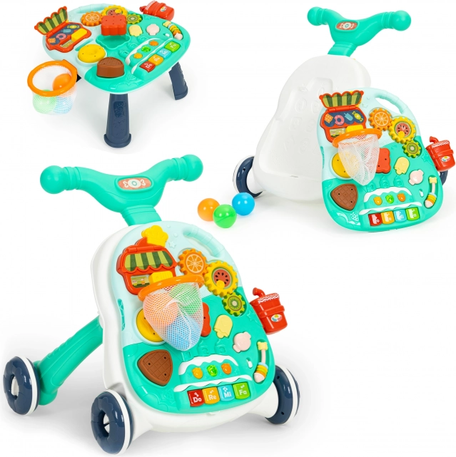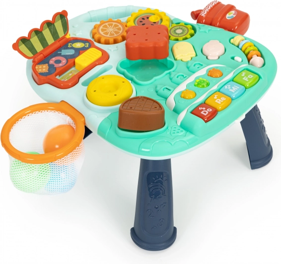 Stůl se skládá z předního panelu odstrkovadla a 3 nohou, které jsou součástí sady, díky možnosti odpojení vaše batole může jej používat jako samostatnou hračkunebo jej proměnit ve funkční stolek plný prvků zajišťujících dobrou zábavu.