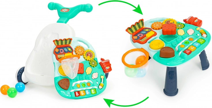 Díky promyšlenému designu lze hračku používat jako odstrkovadlo nebo výukový stolek.