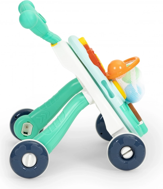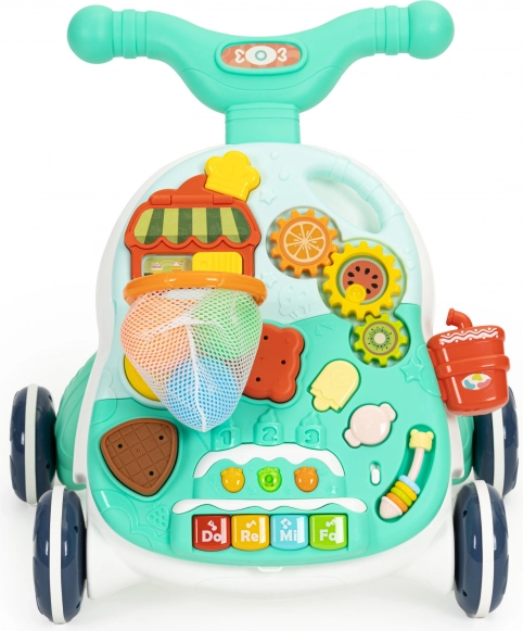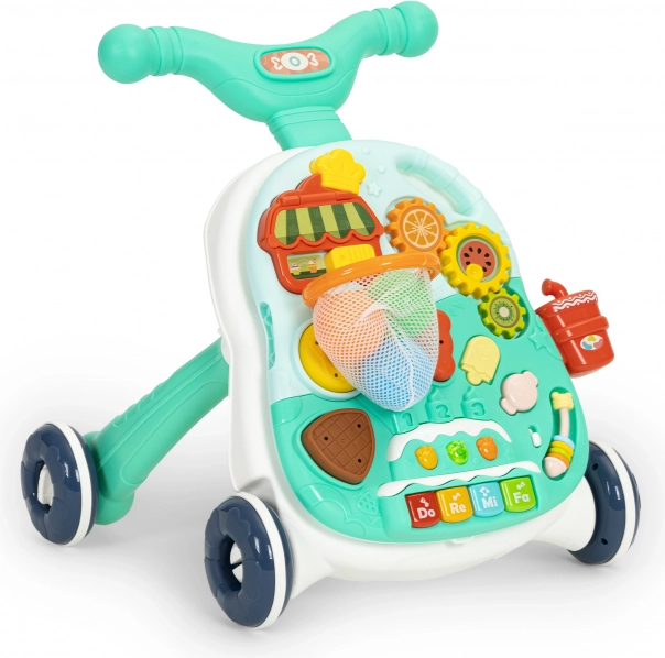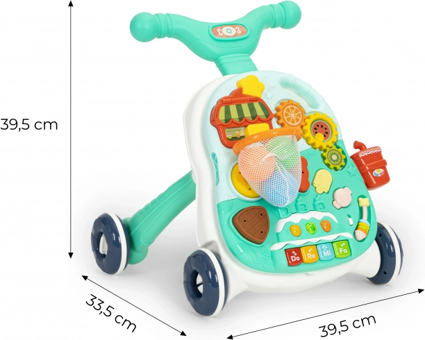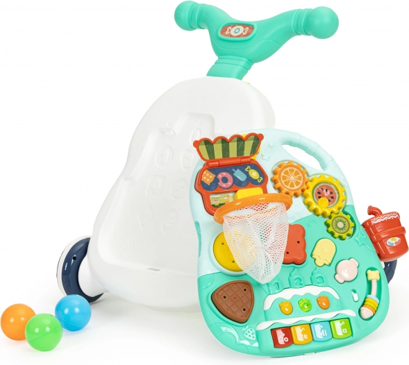 Jednoduše oddělíte panel na přední straně tlakáče, nainstalujete nohy a můžete používat funkční stolek s mnoha pohyblivými prvky. Zajímavým doplňkem je malý klavír, který přehrává zvuky a melodie, ten se jistě rychle stane oblíbeným prvkem hračky, poskytne každému dítěti skvělou zábavu.