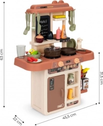 Kuchyňka nabízí funkce jako opravdová, včetně parního generátoru a osvětlených hořáků. Má skutečný vodní kohoutek a malý kuchař si může psát objednávky na připravený křídový tabule.
