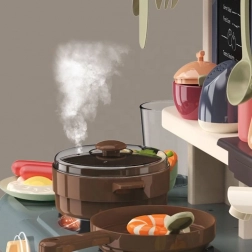 Kuchyňka nabízí červeně osvícené hořáky s imitací varného zvuku a parní generátor pro realistické hraní.