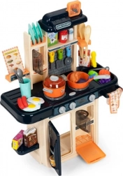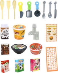 Bohatý set 42 prvků zahrnuje hrnec s poklicí, pánev, náčiní, talíře, hrnek, ovoce a zeleninu, rybu, kuře, kraba, vejce, balení „mléka“, „kečup“, krabičky od zmrzliny a další. Vše je z kvalitního plastu a kartonu, bez ostrých hran pro bezpečnou hru. Kuchyňka podporuje role-play, učení základů vaření a pořádku.