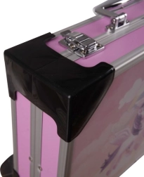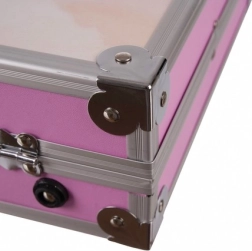 Růžový kufřík s kovovými hranami, rohy a uzávěry udrží pořádek a ochrání pomůcky při přenášení doma i na cestách.