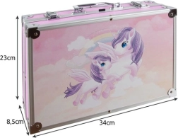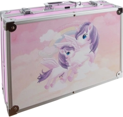 Objevte kompletní malířský set v pevném růžovém kufříku s motivem jednorožců – ideální pro děti i začínající tvůrce. Uvnitř najdete vše pro kreslení, kolorování i malbu: fixy, barevné tužky, olejové pastely, akvarelové i akrylové barvy a praktické doplňky. Díky organizéru s přihrádkami zůstanou pomůcky přehledně srovnané a v bezpečí. Odolné kovové rohy a zámky chrání obsah při přenášení.