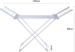 Rozměry 146 × 98 × 55 cm poskytují dostatek místa na prádlo celé rodiny. Využijte křídla pro delší kusy a rychlejší proudění vzduchu.