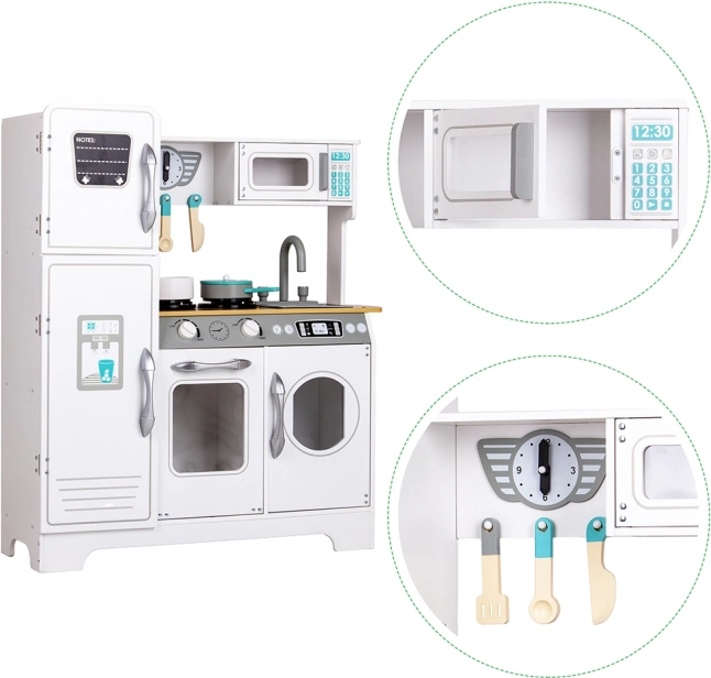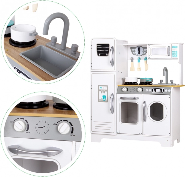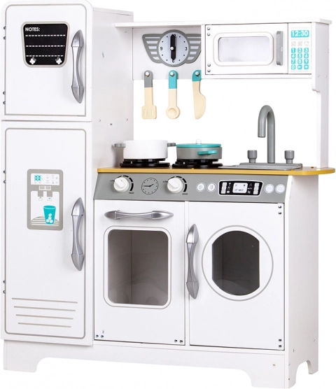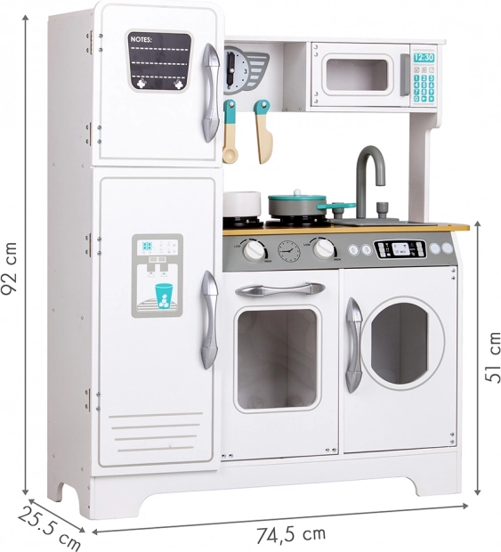 Stylová dětská kuchyňka z masivního dřeva pro malé kuchaře od 3 let. Nabízí realistické ovládací knoflíky s cvakáním, otevírací lednici, troubu a mikrovlnku, prostorný dřez a dokonce i „pračka“ pro hru na domácnost. Součástí je 5 dřevěných kuchyňských doplňků pro hodiny kreativní zábavy a rozvoj fantazie a jemné motoriky.