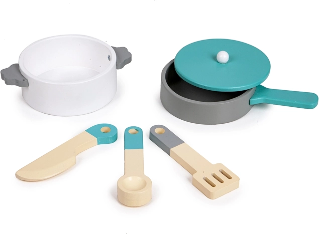 Součástí je „pračka“ pro hru na domácnost a pět dřevěných doplňků: hrnek, pánev s poklicí, lžíce, obracečka a nůž. Vše z bezpečně lakovaného dřeva.