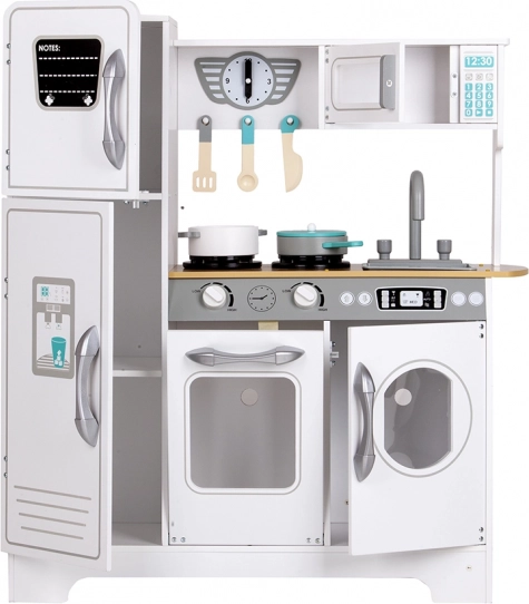 Objevte robustní bílou kuchyňku ECOTOYS, která promění každý dětský pokoj v malé kulinářské studio. Díky realistickým prvkům – od otočných knoflíků se zvukem přes otevírací dvířka až po funkční úložné prostory – děti zažijí autentickou hru na vaření, pečení i mytí nádobí.