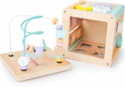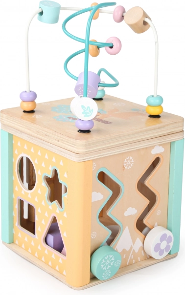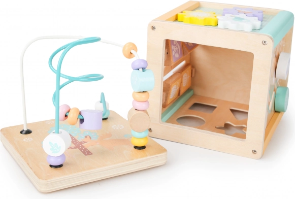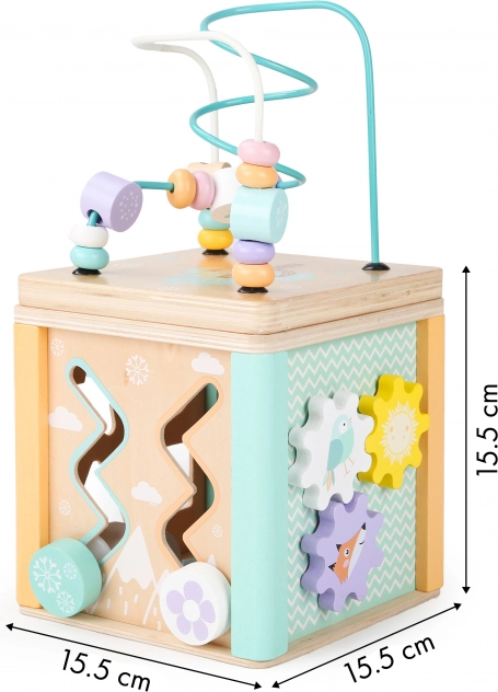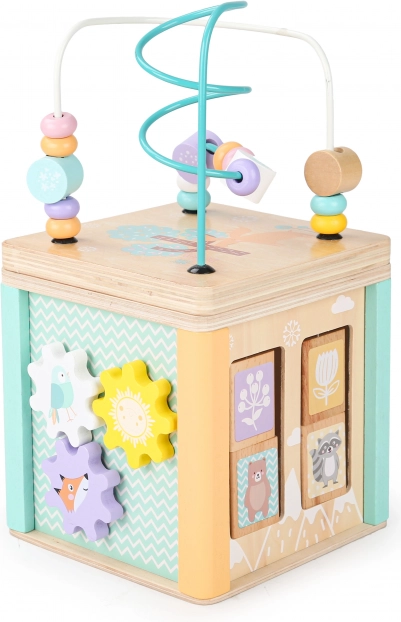 Každá stěna kostky nabízí odlišné herní prvky, jako je bludiště, posuvné puzzle nebo otáčivé ozubená kolečka, které podporují motorické i kognitivní dovednosti dítěte.