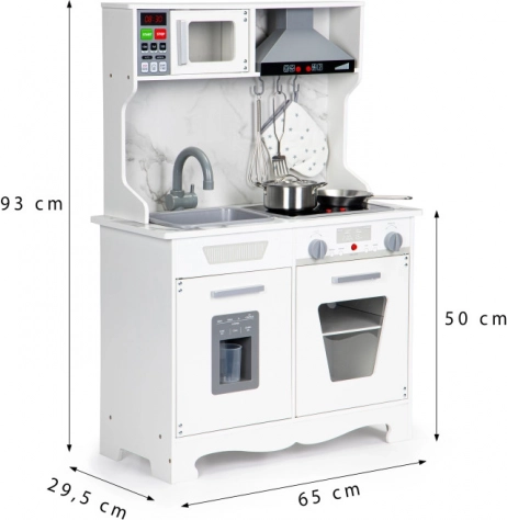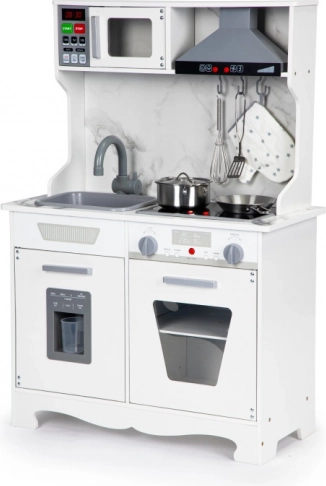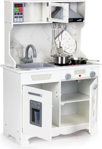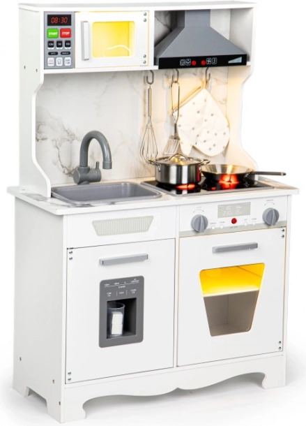 Udělejte svým dětem radost s touto dřevěnou kuchyňkou, která napodobuje opravdovou kuchyň a je určena pro děti od 3 let. Obsahuje světelné a zvukové efekty, které zahrnují osvětlení hořáků a trouby s realistickými zvuky. Děti si mohou hrát a rozvíjet svou fantazii a manuální dovednosti, aniž by postrádaly zábavu.