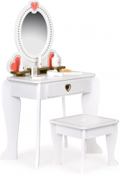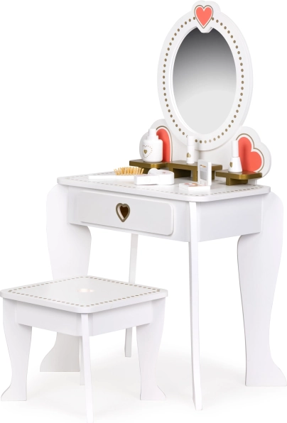 Toaletní stolek s velkoplošným zrcadlem a dekorativním rámem s motivy srdíček je perfektní pro roli malé princezny nebo vizážistky. Konstrukce je bezpečná a poskytuje dostatek prostoru pro fantazijní hry.