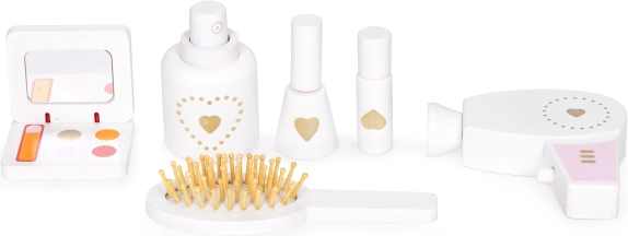K toaletnímu stolku patří hračkové příslušenství jako toy fén, dřevěný kartáč a malé zrcadlo. Všechny doplňky mají hladké hrany, což zajišťuje bezpečnost pro děti.
