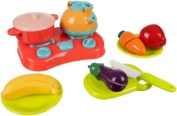 - Bohatá výbava: nožík, prkénko, talířky, mini kuchyňka, hrnec, čajník a 15+ kusů ovoce a zeleniny