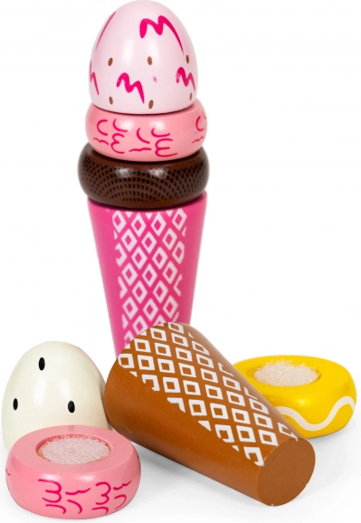 Sada obsahuje 9 prvků z kvalitního dřeva, které spojuje suchý zip, a je vhodná pro děti od 3 let. Rozměry zmrzliny jsou 12 cm, stojan měří 6x12x12,5 cm.
