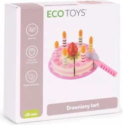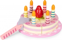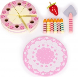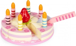 Obsah sady: kulatý dort rozdělený na porce, 6 pruhovaných svíček, dřevěná jahůdka, servírovací lopatka a ozdobný talíř. Vše je vyrobené ze dřeva a natřené barvami bezpečnými pro děti. Sada podněcuje rolové hry, trénuje koordinaci oko–ruka a učí děti sdílení i obsluze hostů.