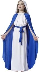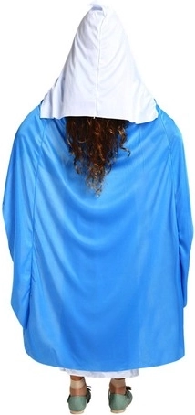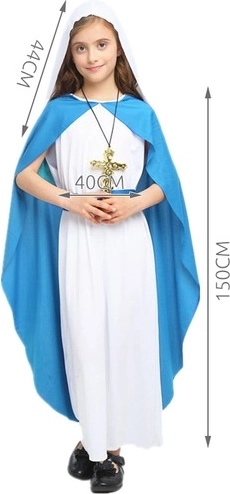 Tento tradiční kostým Panny Marie tvoří dlouhé bílé šaty s modrým pláštěm, které decentně a působivě vyjadřují skromnost a oddanost postavy. Díky lehkému a měkkému polyesteru se dětem pohodlně nosí, neškrtí a umožňuje svobodný pohyb během vystoupení i her.