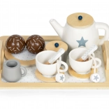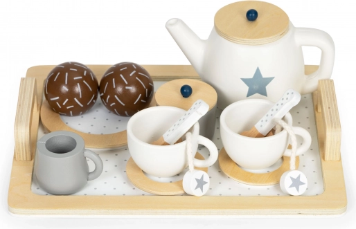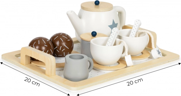 Tác, konvička, dva šálky s podšálky a lžičkami, džbánek, cukřenka, mléčenka, talíř a sladké dobroty – dohromady 17 pečlivě vyrobených dílů pro realistickou hru.