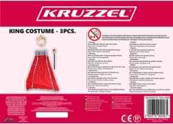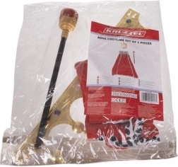 Tento kompletní set promění vaše dítě v okouzlujícího krále během chvilky. Plášť z měkkého textilu v hluboké červené barvě je lemován černo-bílou kožešinkou a zavazuje se dlouhými tkanicemi pro pohodlné a jisté nošení. Lehké žezlo s červeným „drahokamem“ dodá kostýmu autoritu a flexibilní zlatá koruna s barevnými kamínky dokončí královský vzhled.