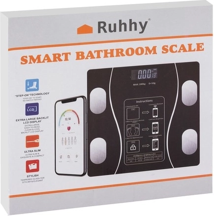 Udržujte si přehled o své kondici díky inteligentní váze RUHHY. Díky čtyřem přesným senzorům a Bluetooth připojení získáte detailní analýzu těla přímo v telefonu. Skleněná platforma z tvrzeného skla v elegantní černi skvěle zapadne do každé koupelny a poskytne bezpečné a stabilní měření až do 180 kg.