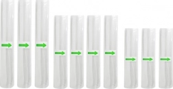 Okamžitě připravena k použití: 9 rolí fólie, 5 velkých sáčků, hadička pro odsávání, korek na lahve a praktický řezák.