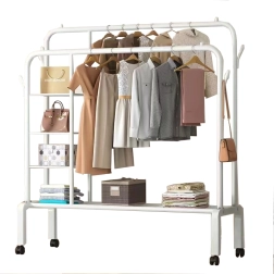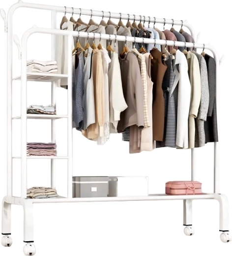 Díky spodní polici lze věšák využít i jako sušák na prádlo nebo praktické místo pro organizaci obuvi a boxů. Volně otočná kolečka usnadňují přesun po místnosti, takže věšák rychle přizpůsobíte aktuálním potřebám.