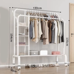 Tento multifunkční volně stojící věšák je ideální do předsíně, ložnice i šatny. Dvě úrovně pro zavěšení poskytují velký prostor pro kabáty, saka a košile, zatímco háčky po stranách pojmou tašky, klobouky a šály. Pevná konstrukce z uhlíkové oceli zajišťuje stabilitu a dlouhou životnost, bílá barva se snadno sladí s moderním interiérem.