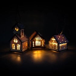 Roztomilá dřevěná dekorace v podobě malého domečku o rozměrech 5 × 5 × 5 cm zaujme svým pohádkovým vzhledem a kouzelnými vlnkami na střechách. Součástí je LED svíčka s vyměnitelnou 3V baterií, která vytváří útulné světlo. Domeček je hned připraven k použití – můžete ho zavěsit díky jutovému provázku nebo postavit na poličku či stůl.