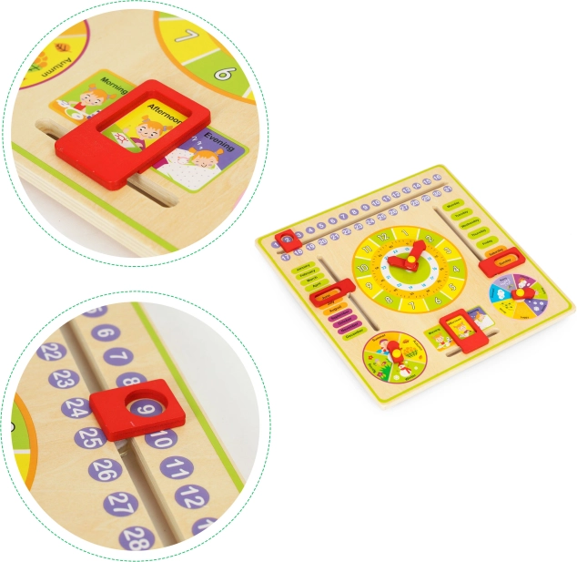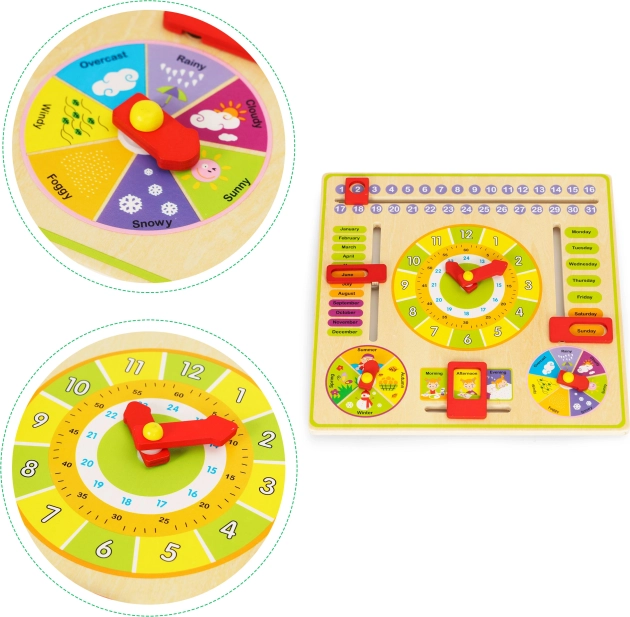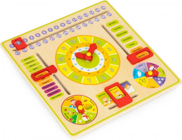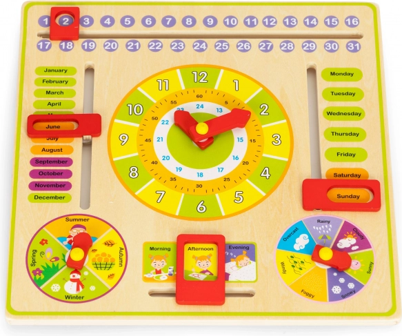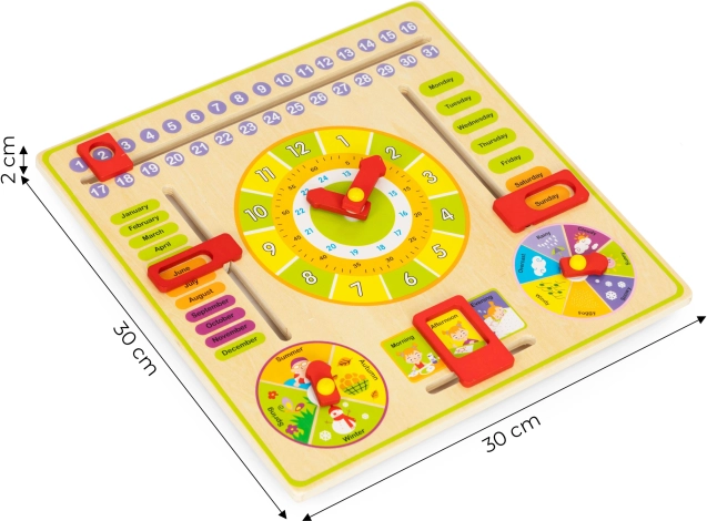 Deska umožní dětem naučit se dny v týdnu, měsíce a roční období a zároveň jim pomáhá správně číst čas. Navíc rozvíjí manuální dovednosti a neobsahuje ostré hrany, což je bezpečné pro děti.