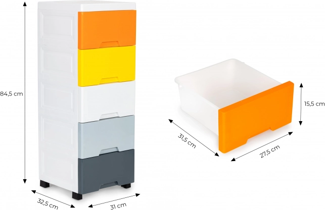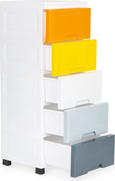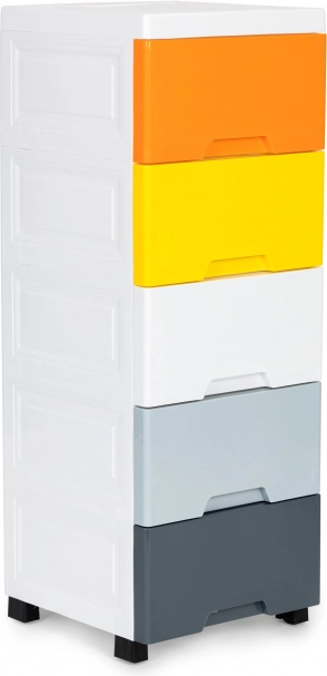 Užijte si přehledné a stylové ukládání hraček, kosmetiky nebo drobností. Tento vysoký a úzký organizér šetří místo, zatímco pět prostorných zásuvek v různých barvách pomáhá s tříděním a rychlým nalezením věcí. Čistý bílý rám zapadne do moderních interiérů a snadno se udržuje.