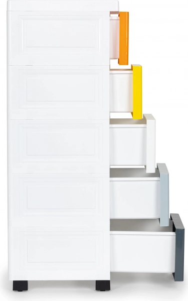 Pět prostorných šuplíků v různých barvách zjednoduší třídění a rychlou orientaci. Přední ergonomické úchyty umožňují plynulé vysouvání a zasouvání.