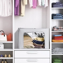 Uložte ložní prádlo, ručníky, sezónní oblečení i deky přehledně a bez prachu. Úložné boxy s čelním průhledným panelem na dvojitý zip umožňují rychlý přístup i když jsou naskládané, a kovová výztuha drží tvar pro snadné stohování. Elegantní šedé provedení ladí do každé skříně či šatny.