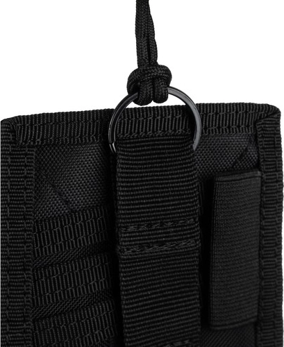 Zadní část skrývá 3 nezávislé kapsy na menší dokumenty (občanka, řidičák, platební karta) s dodatečným zajišťujícím páskem na suchý zip. Nechybí očko s kroužkem a šňůrkou na krk, úchyt na propisku a možnost připevnění k opasku – vše pro maximální praktičnost a bezpečné nošení.