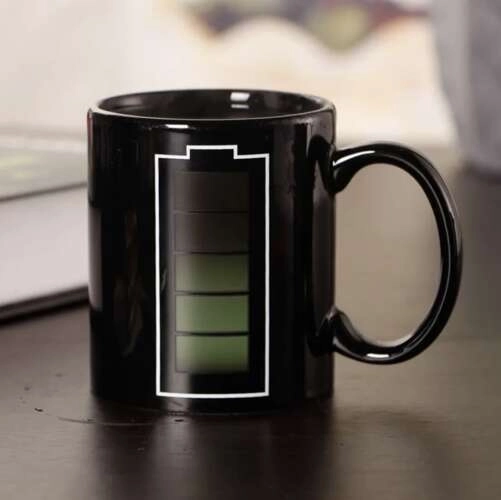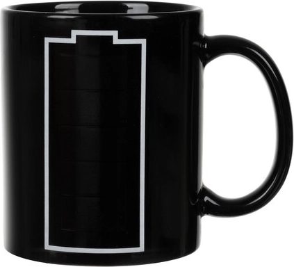 Potřebujete dobít energii? Tento magický hrnek vám ji ukáže doslova. Po nalití horkého nápoje se bílý obrys ikony baterie postupně vyplňuje zelenou barvou – jako by se baterie nabíjela. Jak nápoj chladne, barva mizí, takže vždy víte, kdy je čas na další doušek.