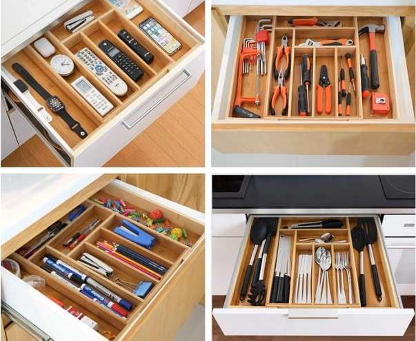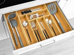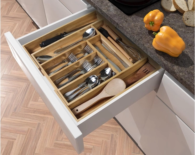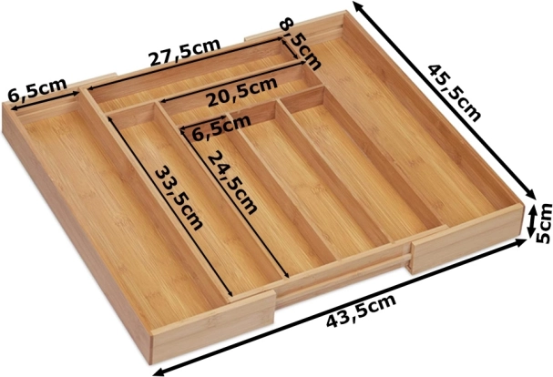 Rozšířitelné sekce poskytují flexibilitu pro různé šířky zásuvek, což činí tento organizér univerzálně použitelným pro každou kuchyň. Jeho vysoká kvalita zpracování zaručuje dlouhou životnost a přináší estetický prvek do každého prostoru.