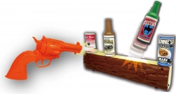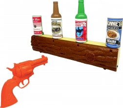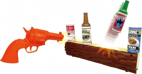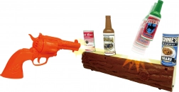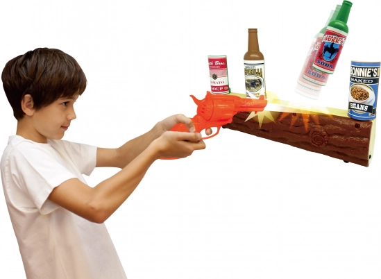 Oranžový revolver, dřevěné „trámové“ stanoviště a cíle v podobě plechovek a lahví vytvářejí atmosféru Divokého západu, která děti vtáhne do hry.