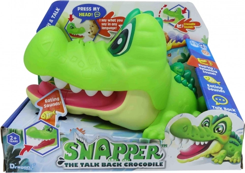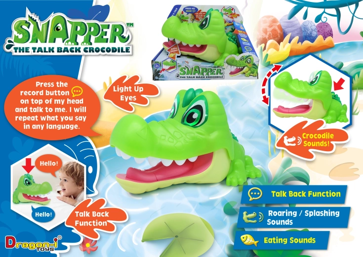 Mluvící krokodýl Snapper je roztomilá interaktivní hračka, která děti motivuje k mluvení, naslouchání a napodobování. Reaguje na dětský hlas, slova i zvuky a s nadšením je opakuje, čímž přirozeně rozvíjí jazykové a komunikační schopnosti.