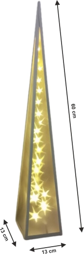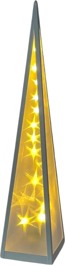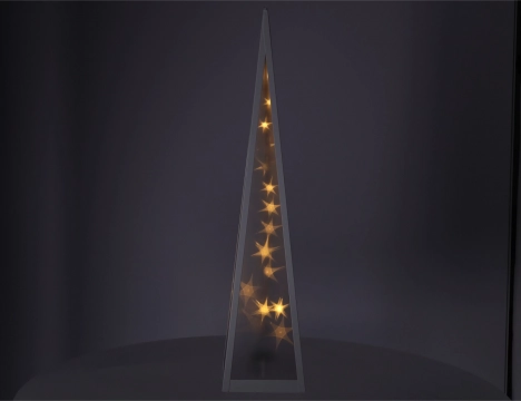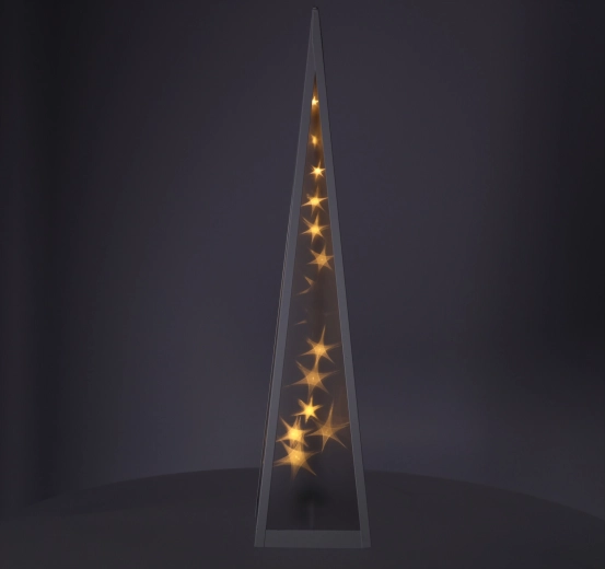 Elegantní vánoční LED dekorace ve tvaru pyramidy s bílým kovovým rámem a hvězdami vytváří teplé, uklidňující světlo. Energeticky úsporné LED, teplá bílá barva a kvalitní zpracování jsou ideální pro vánoční výzdobu interiéru v moderním i klasickém stylu.