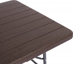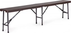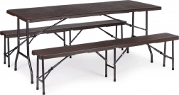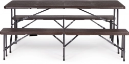 Tato robustní cateringová sada zahrnuje velký stůl (179 × 74 × 74 cm) a dvě lavice (180 × 25 × 43 cm) pro pohodlné posezení až 8 osob. Desky z odolného HDPE s texturou dřeva jsou snadno omyvatelné a odolné vůči skvrnám, kovový rám zajišťuje vysokou stabilitu a dlouhou životnost i při venkovním použití.