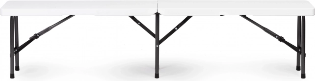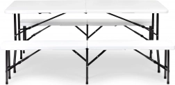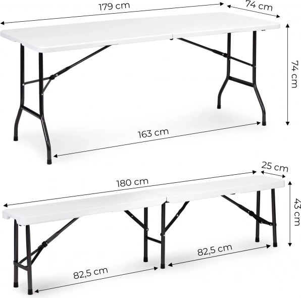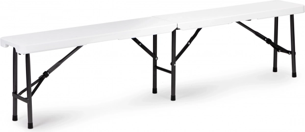 Tento bílý skládací set zahrnuje prostorný stůl (179 × 74 cm) a dvě lavice (180 × 25 cm), které poskytnou pohodlné sezení až pro 8 osob. Desky z odolného HDPE snesou každodenní použití venku i uvnitř, kovová konstrukce zajišťuje vysokou stabilitu a jistotu při sezení i stolování.