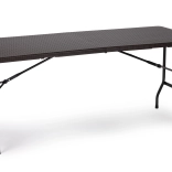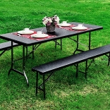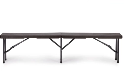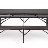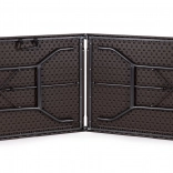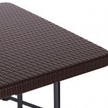 Deska stolu i sedáky lavic mají elegantní ratanový dekor, který je snadno omyvatelný a odolný vůči skvrnám i počasí. Stůl unese až 100 kg, lavice pohodlně poslouží 4 dospělým na jednu. Po akci set během chvilky složíte a uložíte do auta či komory.